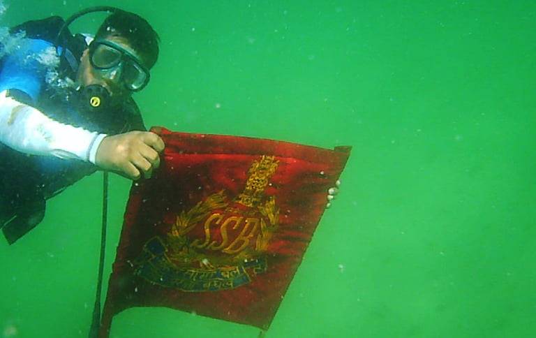 Sashastra Seema Bal (SSB) celebrated its 55th Raising day in unique way. On one hand the SSB organised a function at the Sashastra Seema Bal headquarter in Delhi’s Ghironi on Tuesday, a diving team led by Assistant Commandant Divesh unfurled the Sashastra Seema Bal flag at the bottom of Arabian Sea off the Porbandar coast.