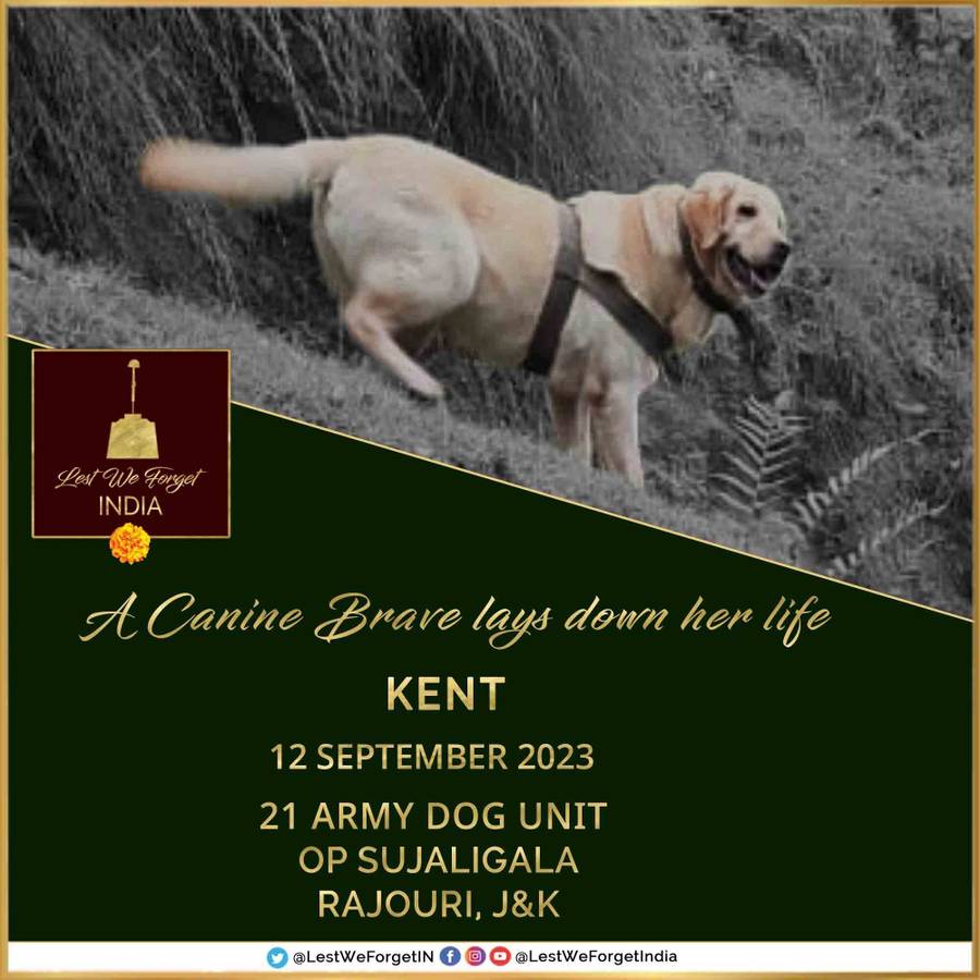 जम्मू कश्मीर के राजौरी में आतंकवादियों का पीछा कर रहे सैनिकों का नेतृत्व कर रही मादा श्वान ( female dog ) केंट की बहादुरी को सब याद कर रहे हैं. कई सैनिक कार्रवाइयों में कामयाबी दिलाने वाली लेब्राडोर नसल की सुनहरी रंग की 6 वर्षीया केंट एक सच्चे फौजी की तरह फर्ज़ की खातिर अपनी जान पर खेल गई .