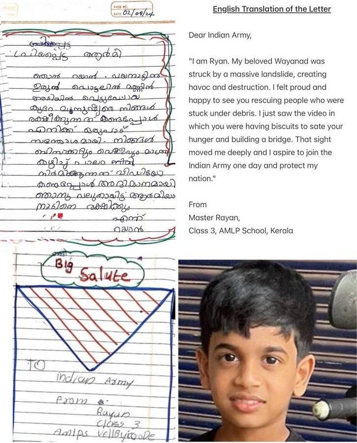 दरअसल , हाल ही में भारतीय सेना की दक्षिणी कमान ( southern command ) ने अपने आधिकारिक एक्स हैंडल पर बच्चे के पत्र और उनकी प्रतिक्रिया को साझा किया है . वायनाड में एएमएलपी स्कूल के कक्षा 3 के छात्र रेयान ने अपनी स्कूल डायरी में यह पत्र लिखा था. उसने कहा कि सैनिकों को मलबे के नीचे से लोगों को बचाते हुए देखकर उसे “गर्व और खुशी” महसूस हुई.