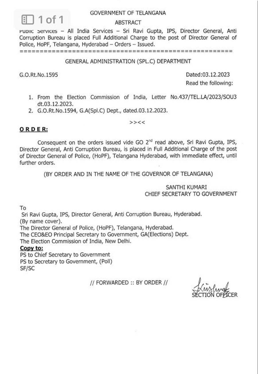 भारतीय पुलिस सेवा के 1990 बैच के अधिकारी रवि गुप्ता (ips ravi gupta) को तेलंगाना पुलिस के महानिदेशक के ओहदे की अतिरिक्त ज़िम्मेदारी सौंपे जाने का आदेश मुख्य सचिव शान्ति कुमारी की तरफ से जारी किया गया है. आईपीएस रवि गुप्ता भ्रष्टाचार निरोधक ब्यूरो ( anti corruption bureau ) के महानिदेशक हैं तथा उनके पास विजिलेंस व एनफोर्समेंट ( vigilance and enforcement ) के महानिदेशक का भी अतिरिक्त प्रभार है . रवि गुप्ता को पूर्ण रूप से यह अतिरिक्त कार्यभार सौंपा गया है. आईपीएस अंजनी कुमार के निलंबन और उनके स्थान पर रवि गुप्ता को नए कार्यभार देने संबंधी आदेश तुरंत प्रभाव से लागू कर दिए गए हैं .