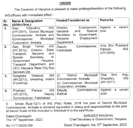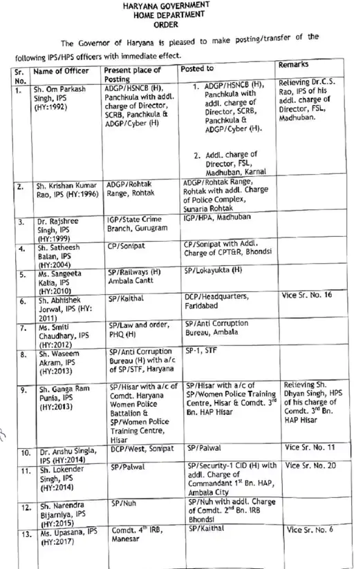 डॉ अंशुल सिंगला को पलवल का एसपी बनाया गया है जबकि लोकेन्द्र सिंह को सुरक्षा में एसपी तैनात किया गया है वह हरियाणा सशस्त्र पुलिस की पहली बटालियन के कमांडेंट का अतिरिक्त प्रभार सौंपा गया है . नूंह के एसपी नरेंद्र बिजारणिया को भोंडसी स्थित आईआरबी क्व्व दूसरी बटालियन का अतिरिक्त कार्यभार दिया गया है . सुश्री उपासना को कैथल का एसपी बनाया गया है जबकि एक अन्य आईपीएस निकिता खट्टर को हरियाणा स्टेट नारकोटिक्स कंट्रोल ब्यूरो का एसपी तैनात किय गया है . आईपीएस अमित यशवर्धन IPS Amit Yashvardhan को डीसीपी ( एन आई टी , फरीदाबाद ) का अतिरिक्त कार्यभार दिया गया है . नरेंद्र कुमार मीणा को फरीदाबाद ज़िले में डीसीपी (क्राइम ) नियुक्त किया गया है .