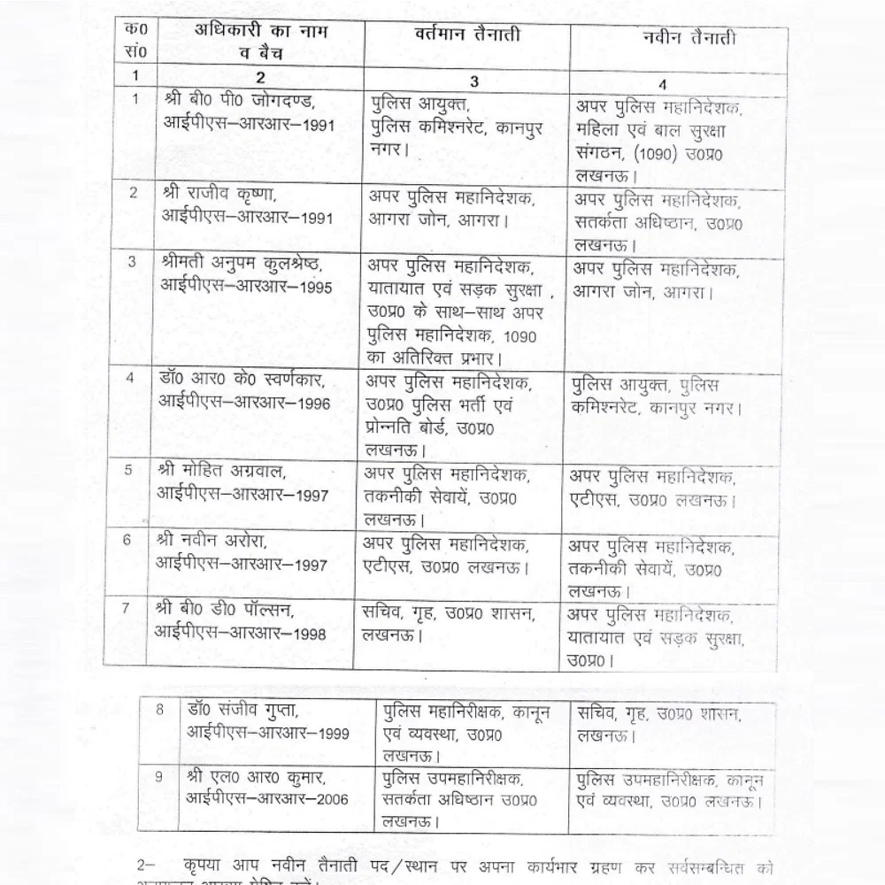 उत्तर प्रदेश शासन ने पुलिस महकमे में बड़ा फेरबदल करते हुए , यहां तैनात भारतीय पुलिस सेवा ( indian police service) के 9 अधिकारियों के तबादले किये गए हैं . यूपी में शनिवार को किये इन तबादलों के तहत नौ आईपीएस आरके स्वर्णकार को कानपुर का कमिश्नर ( kanpur police commissioner ) नियुक्त किया गया है. इसके साथ ही आईपीएस राजीव कृष्णा को आगरा ज़ोन के अपर महानिदेशक के पद से हटाकर एडीजी विजिलेंस बनाया गया है जबकि उनके स्थान पर आईपीएस अनुपम कुलश्रेष्ठ को एडीजी आगरा ज़ोन तैनात किया गया है . एटीएस के एडीजे का बदलना जाना भी इन तबादलों की सूची में अहम है .