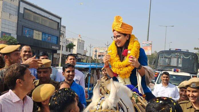 उत्तर भारत में इन दिनों शादियों के सीजन में सड़कों पर घोड़ी पर दूल्हे को बैंड बाजे व ढोल धमाके के साथ ले जाते नाचते बारातियों के नजारे तो खूब देखने को मिल रहे हैं, लेकिन मंगलवार की सुबह राजस्थान के दौसा शहर में ऐसी एक बारात ने लोगों को चौका दिया. असल में यह न तो बारात थी और न ही घोड़ी पर दूल्हा था . दूल्हे जैसे वेश में महिला थी और बैंड बाजे वाले खाकी वर्दी धारक पुलिसकर्मी थे जो आमतौर पर पुलिस परेड में दिखाई देते हैं. जुलूस जैसे इस नज़ारे को सड़क पर देखकर हर कोई शख्स लगातार देखता रहता था. खासतौर पर लोगों की रूचि तब ज्यादा हो जाती थी जब पता चलता कि घोड़ी पर दुल्हे के वेश में सवार असल में दौसा की पुलिस अधीक्षक ( suprintendent of police ) वंदिता राणा हैं .
