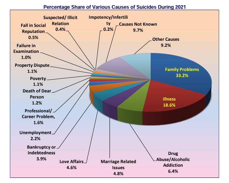 भारत में आत्महत्या के मामले 2010 से अचानक बढ़ने शुरू हुए थे जो तीन साल तो लगभग एक ही स्तर पर रहे लेकिन 2014 से इनमें गिरावट आनी शुरू हुई और ये रुझान 2017 तक देखा गया लेकिन 2018 में भारत में आत्महत्या करने वालों का ग्राफ बढ़ना शुरू हुआ और कोविड – 19 संक्रमण काल के बाद से तो इन मामलों में ज़बरदस्त वृद्धि देखी गई . व्यवसाय के आधार पर वर्गीकरण करके देखा जाए तो 20 21 में भारत में आत्महत्या करने वाले लोगों में 25 प्रतिशत वो थे जो ‘ रोज़ कमाना और रोज़ खाना ‘ वाली जिंदगी जीने वाले दिहाड़ी मजदूर थे . दूसरे नम्बर पर गृहणियां हैं. 2021 में भारत में आत्महत्या करने वालों में 14 फीसदी गृहणियां थीं . दस प्रतिशत प्रोफेशनल लोगों ने आत्महत्या की वहीँ 8 .4 % ने बेरोजगारी से परेशान होकर यह कदम उठाया.