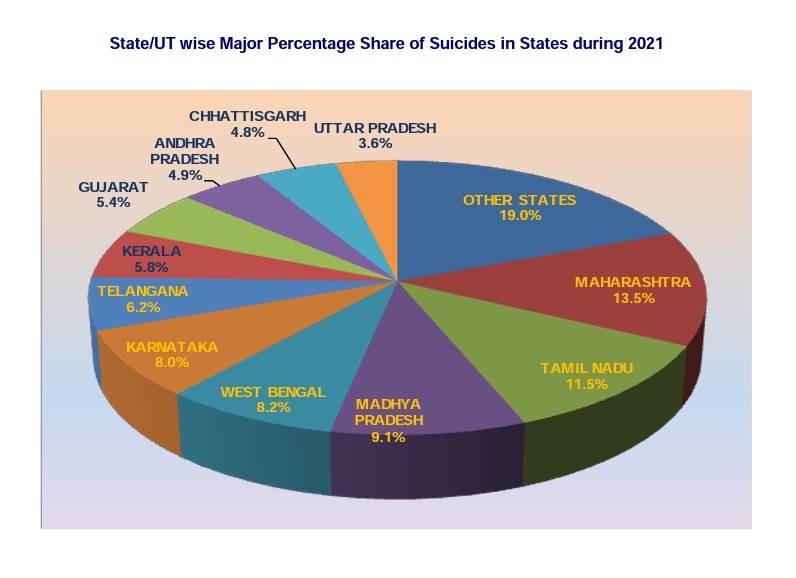 भारत में हर साल 1 लाख से ज्यादा लोग आत्महत्या करते हैं . पिछले कुछ साल में ये संख्या तेज़ी से बढ़ी है . राष्ट्रीय अपराध रिकॉर्ड ब्यूरो ( एनसीआरबी – ncrb ) के मुताबिक़ 2021 में 1 लाख 64 हज़ार से ज्यादा लोगों ने अपनी जिंदगी खुद खत्म की जबकि इससे पांच साल पहले ये संख्या 1 लाख 29 हज़ार 887 थी. प्रतिशत के हिसाब से देखा जाए तो पांच साल में आत्महत्या करने वालों की संख्या में 25 प्रतिशत से ज्यादा का इजाफा हुआ है. 33 प्रतिशत लोगों ने पारिवारिक क्लेश के कारण तो 18 प्रतिशत ने बीमारी से तंग आकर ये कदम उठाया. ये सच में सोचने वाली गंभीर बात है …!पांच राज्य जहां सबसे ज्यादा खुदकशी होती है :